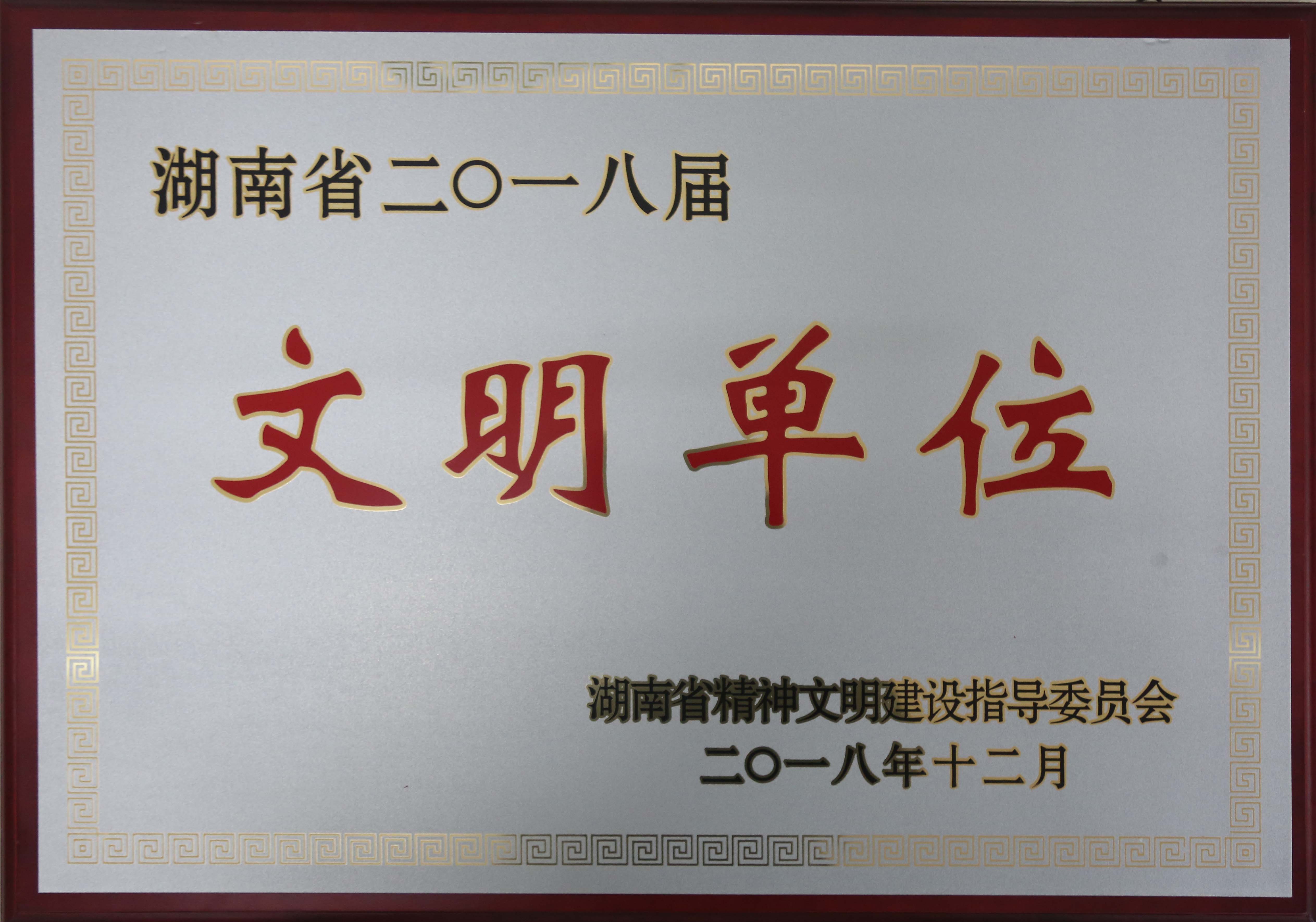 • 2018年12月被湖南省精神文明建設指導委員會評為“湖南省二〇一八屆文明單位”